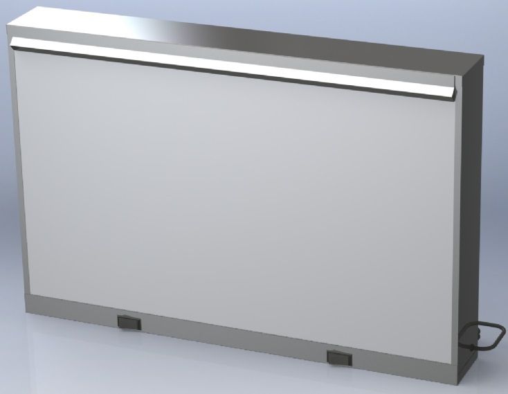 Este modelo de Negatoscópio é de sobrepor, ou seja, ele e instalado como se fosse um quando sobre a parede e fixado com parafusos, sem a necessidade de quebrar ou de adequar a sala para sua instalação necessitando apenas de um único ponto de energia.